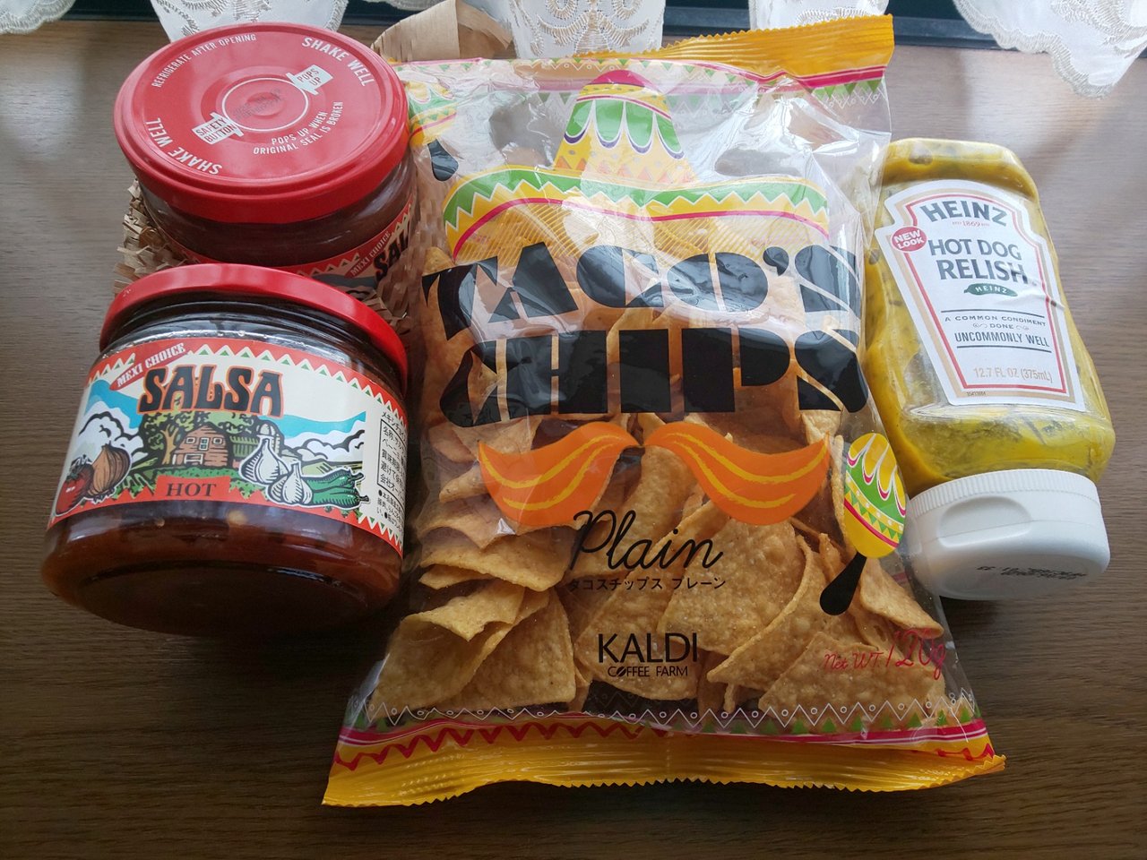 呑兵衛さんには必需品のタコチップスとサルサ🔥と、ホットドッグ🌭用のマスタード的なヤツ❗️