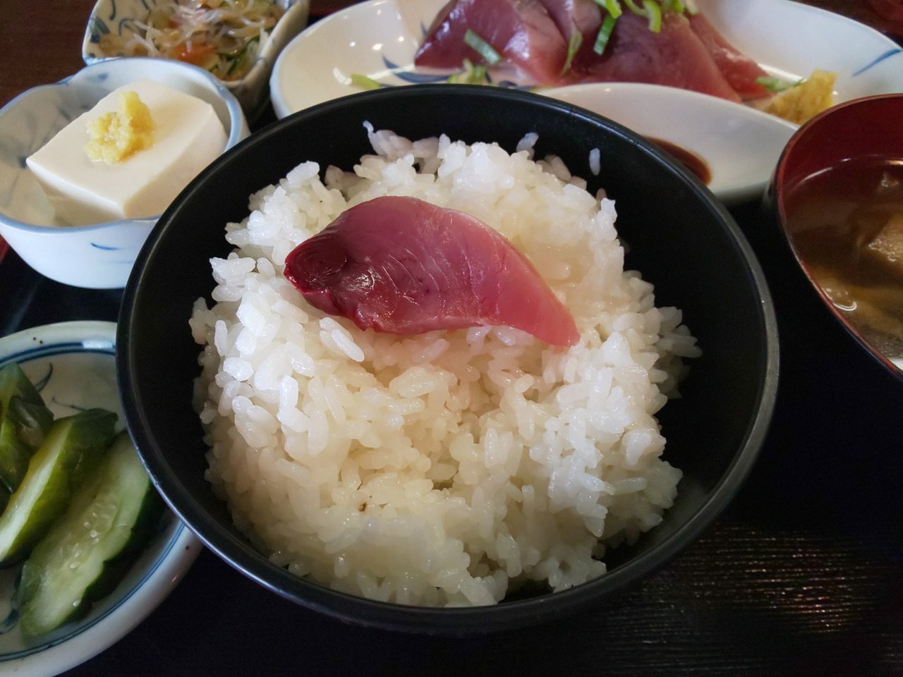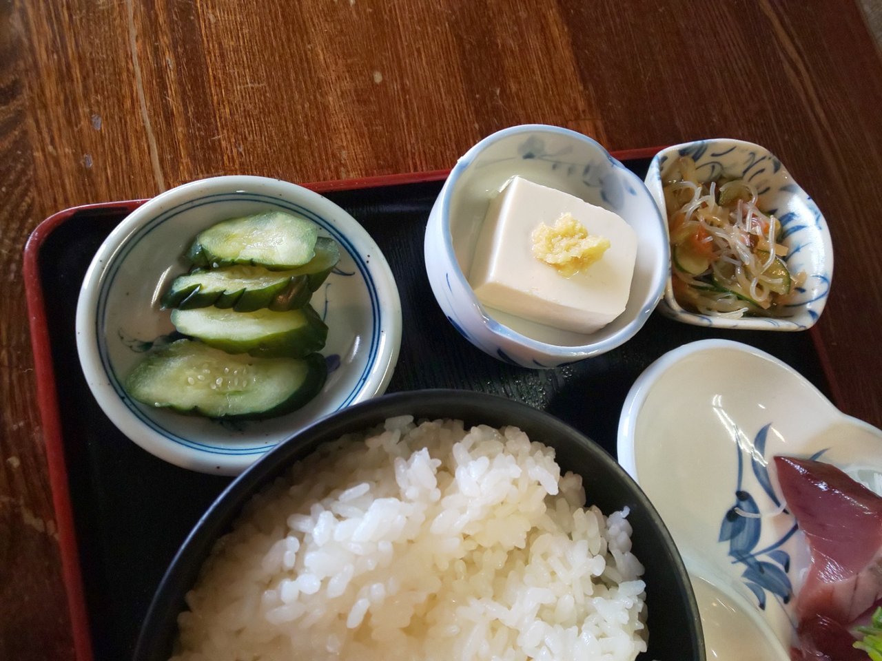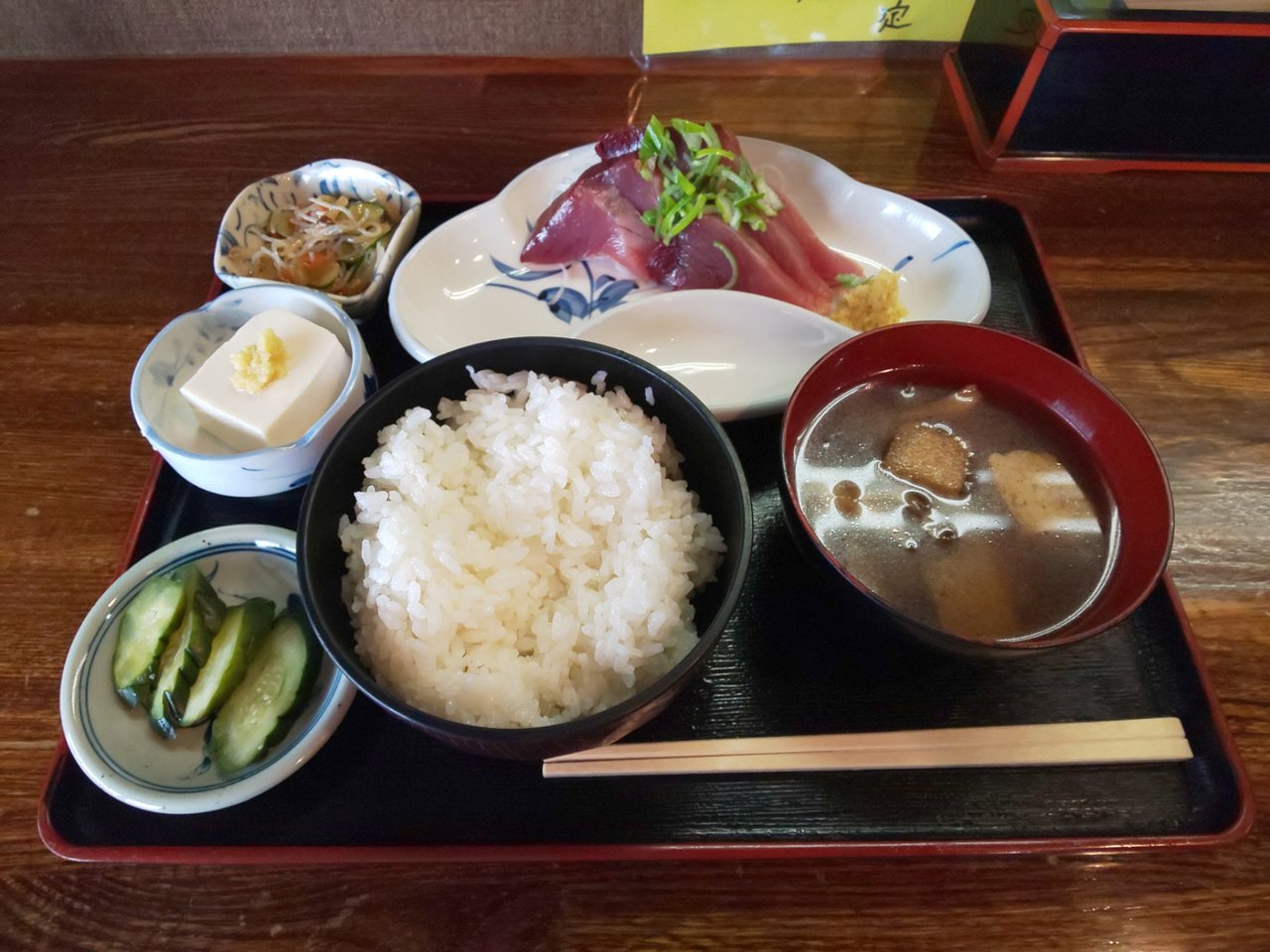本日のランチ 気仙沼かつお刺 メンチカツ マカロニサラダ こぶのつくだ煮 冷奴 もりそば ライス お新香 味噌汁 フルーツ 918円❗️お蕎麦の大盛り 162円 合計1080円也安い💴✨👛❗️