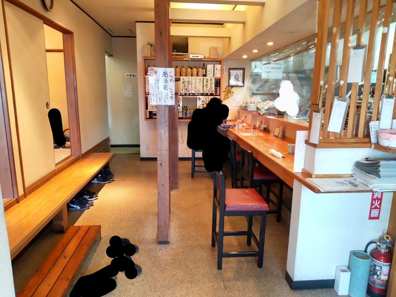 入り口で、必ずアルコール消毒液を付けて、お一人様は、カウンター席に案内されます📋️