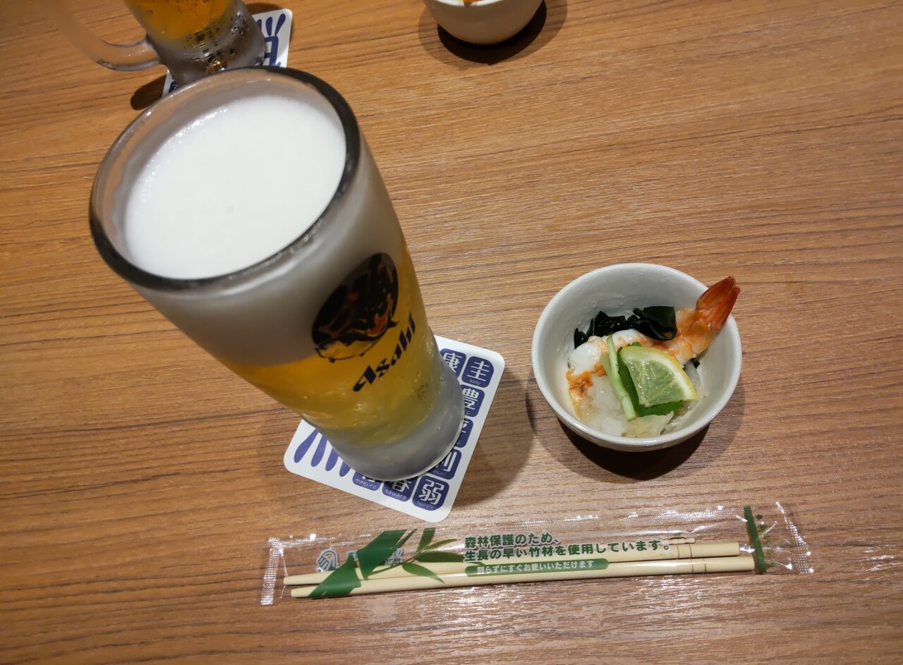お通しは、ボイルエビ🦐と、お刺身くらげ👾の酢の物🍀