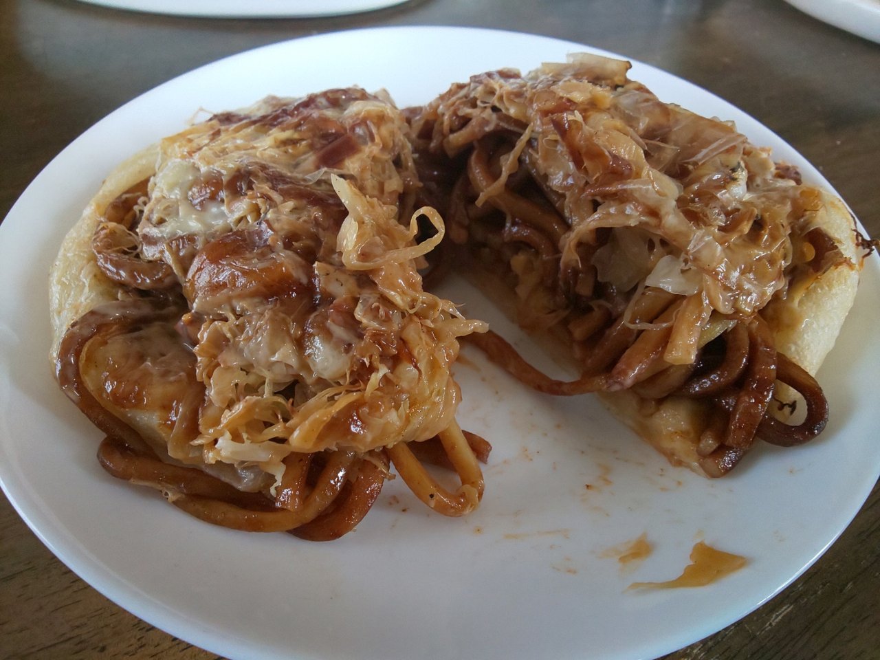 勝手にネーミングした、広島お好み焼きパンは、極太麺の焼きそばをナン的なパンに載せて、お好み焼き風に仕立てて有りました🎵