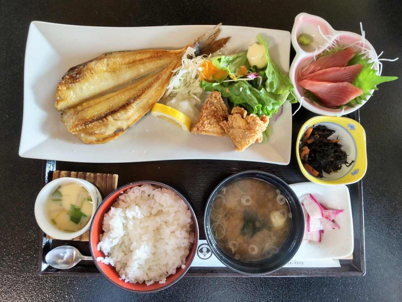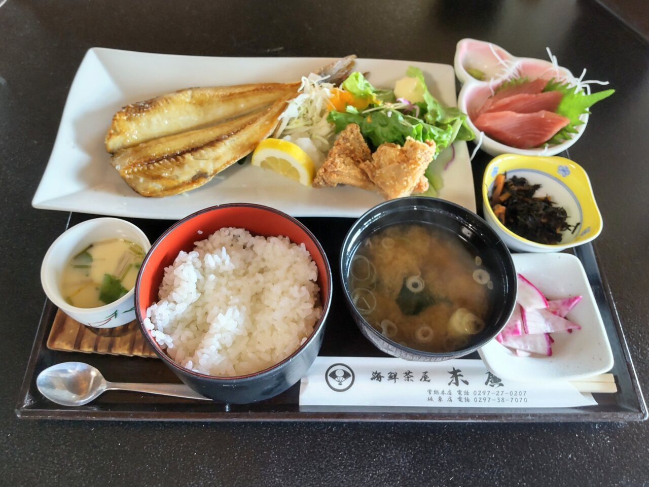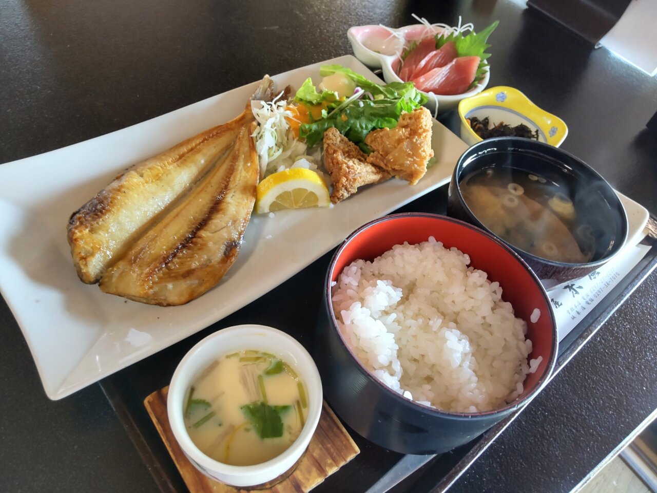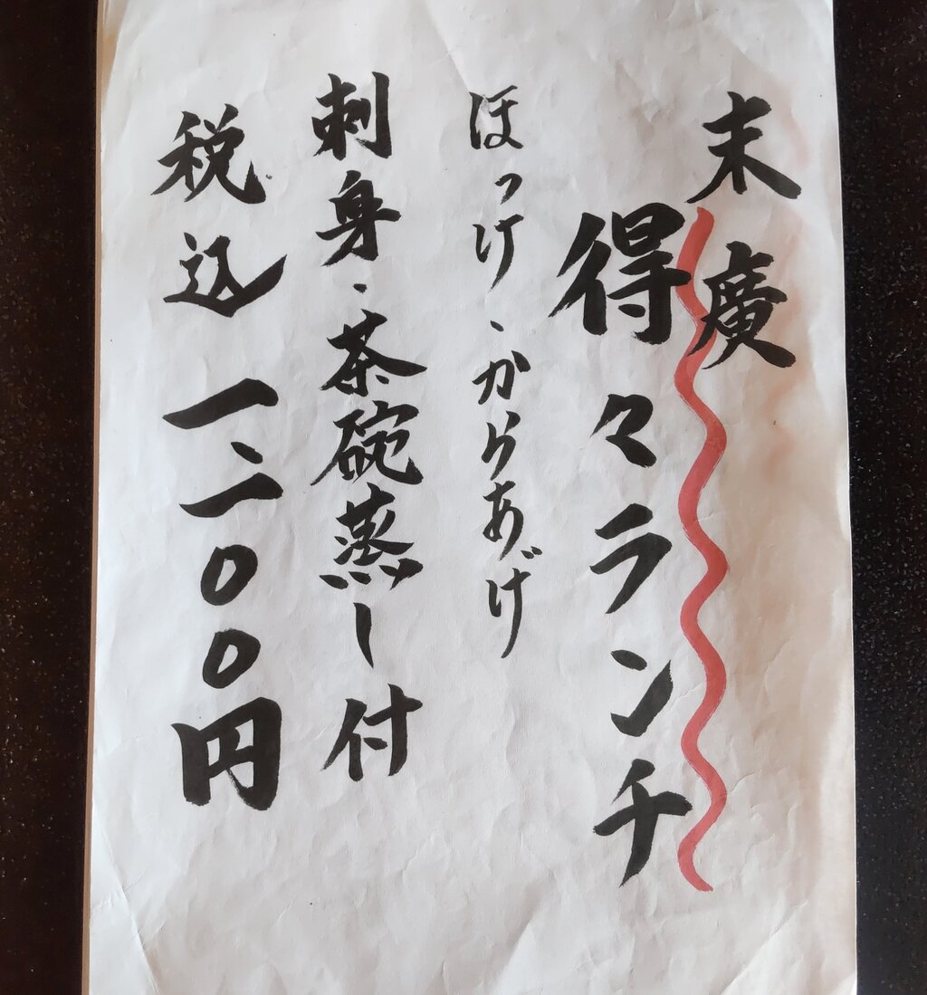 末廣 得々ランチ ほっけ、からあげ、刺身、茶碗蒸し付 1100円