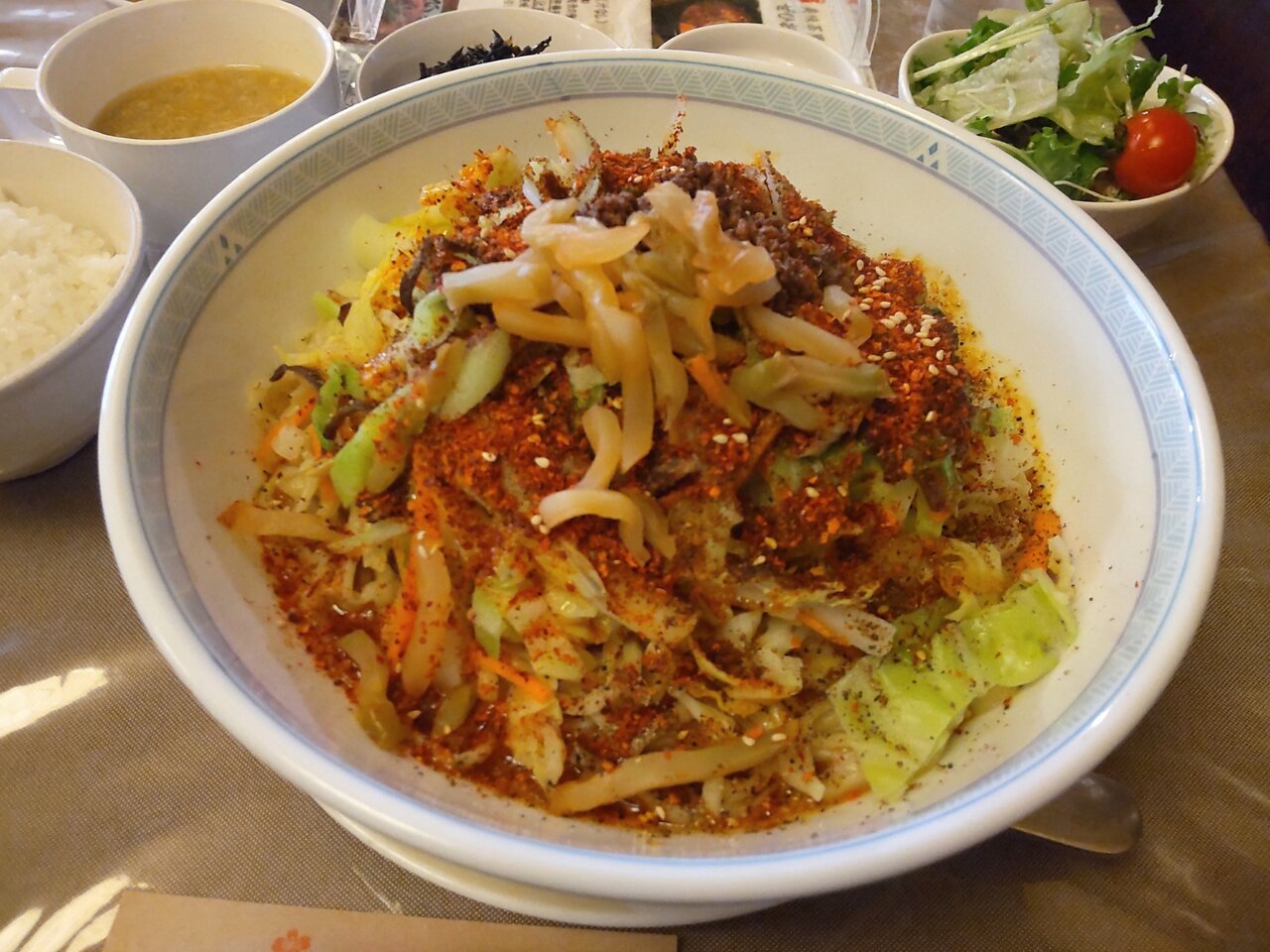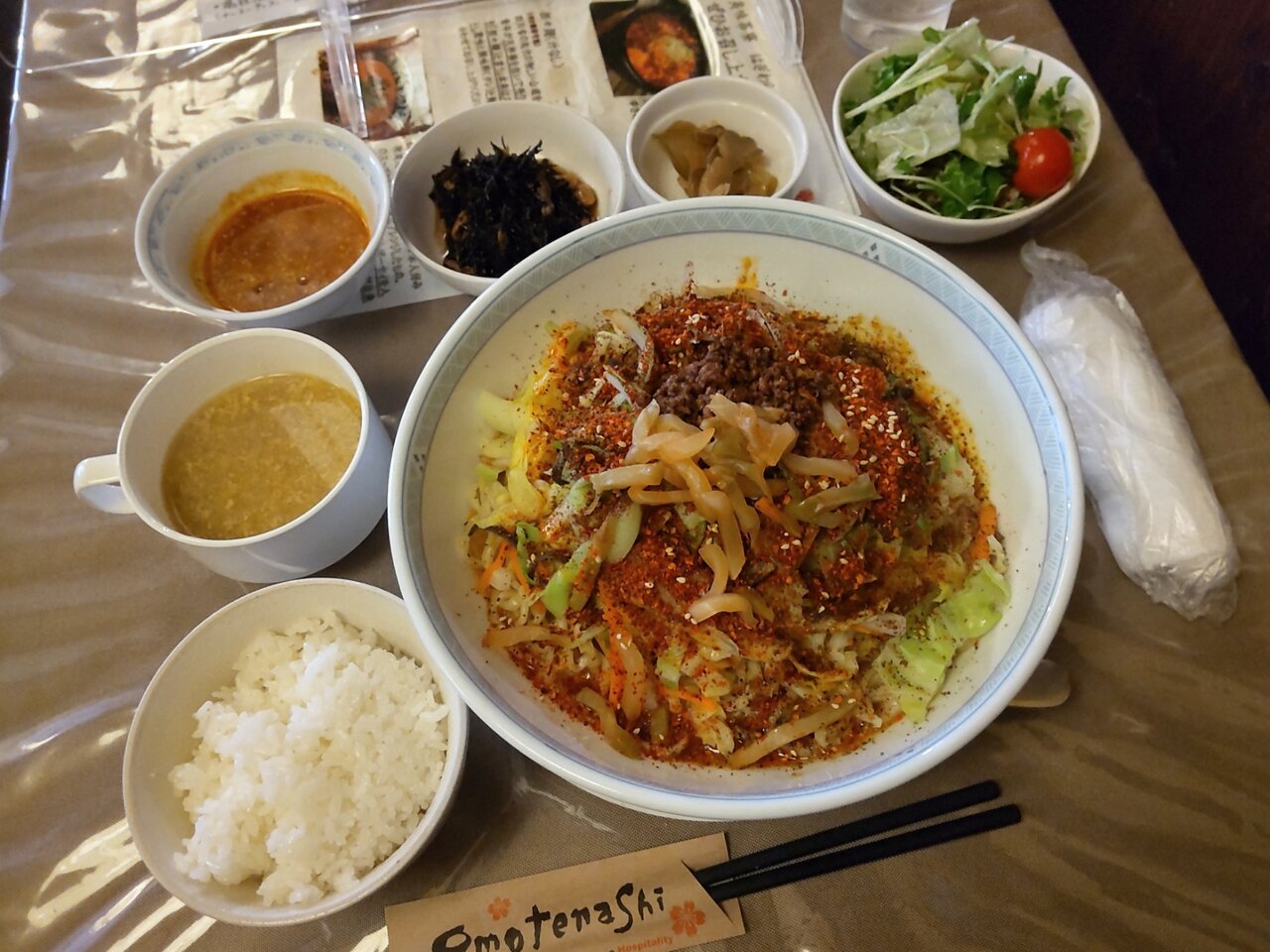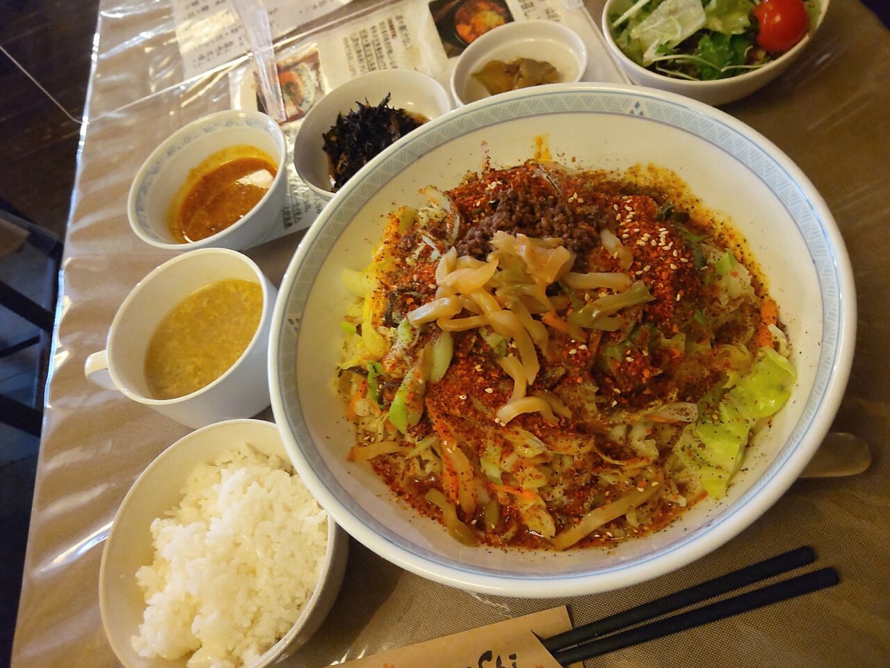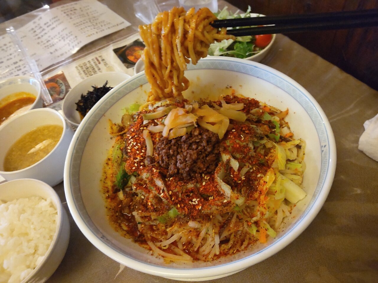 とても美味しい、そして、かなりボリューミーな汁なし担々麺と、ミニサラダセットでした✨😋🍜🍚🥗💕