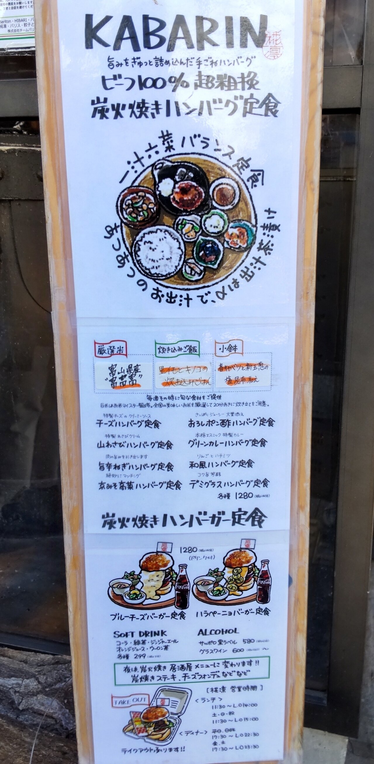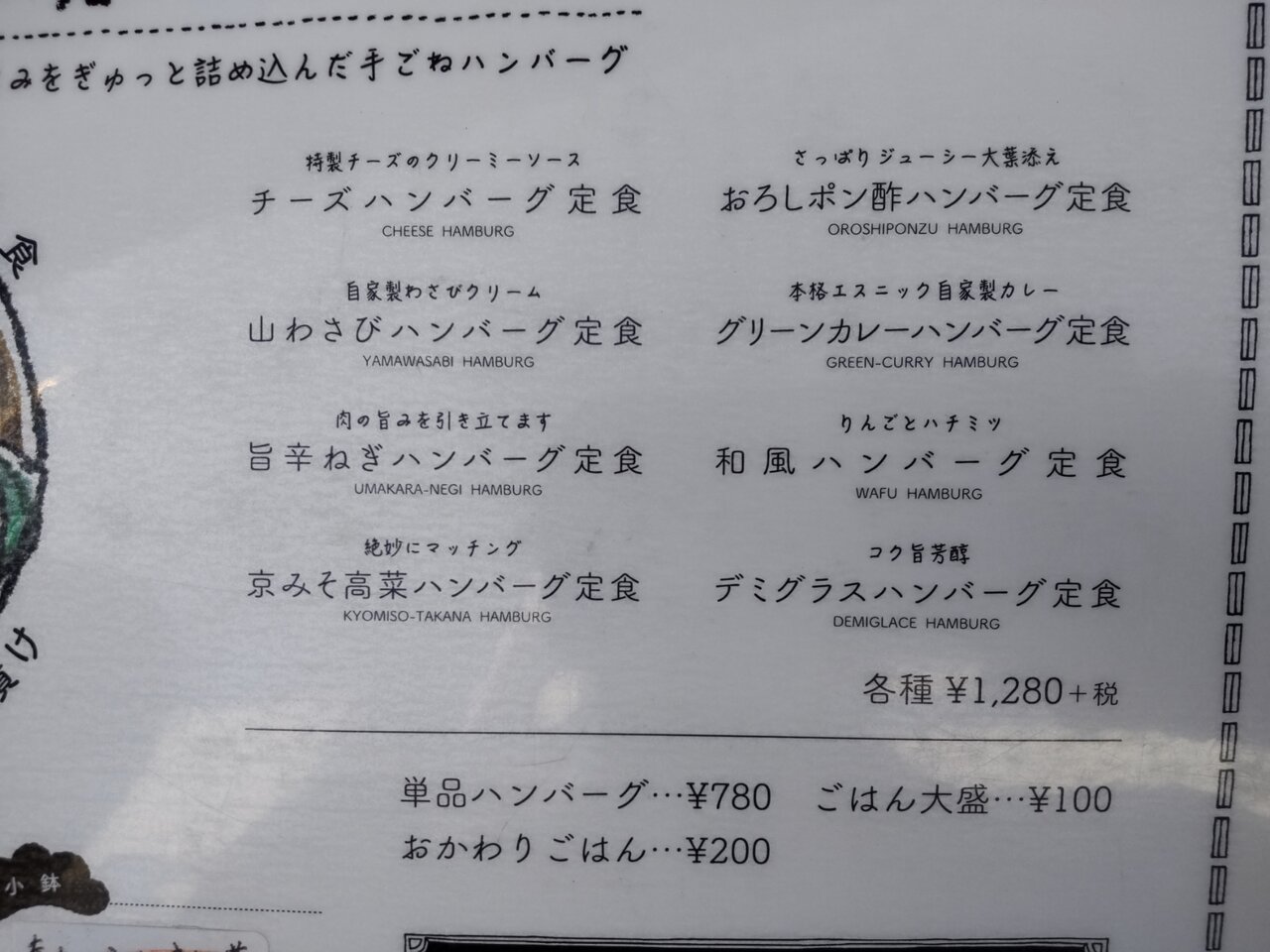 ハンバーグは、チーズ、山わさび、旨辛ねぎ、京みそ高菜、おろしポン酢、グリーンカレー、和風、デミグラスの8種類📋️🥰👍