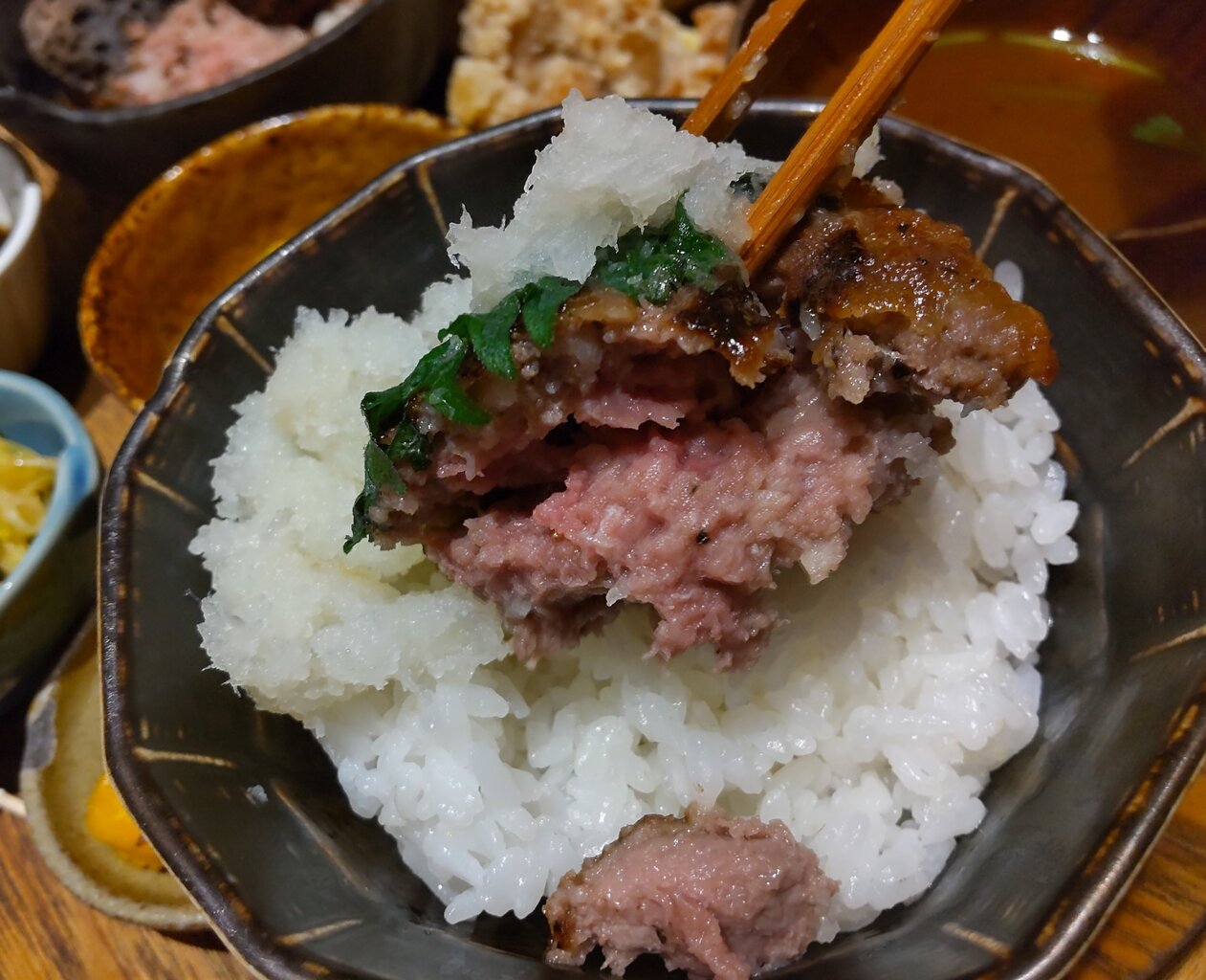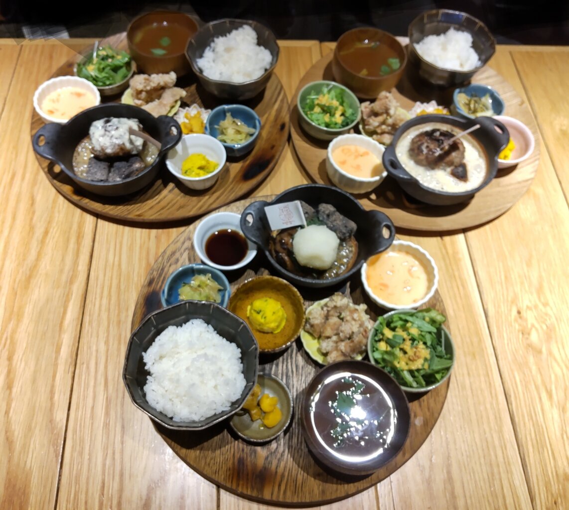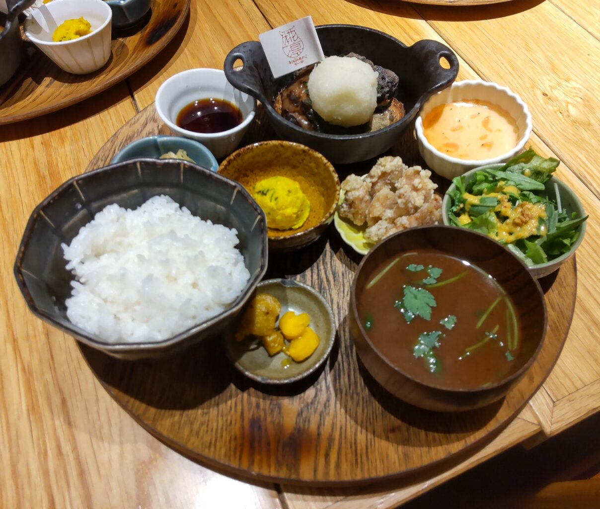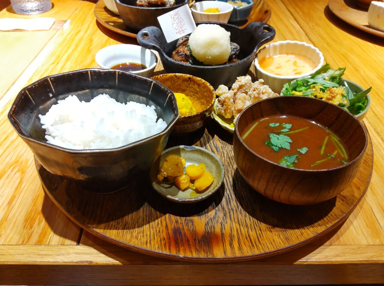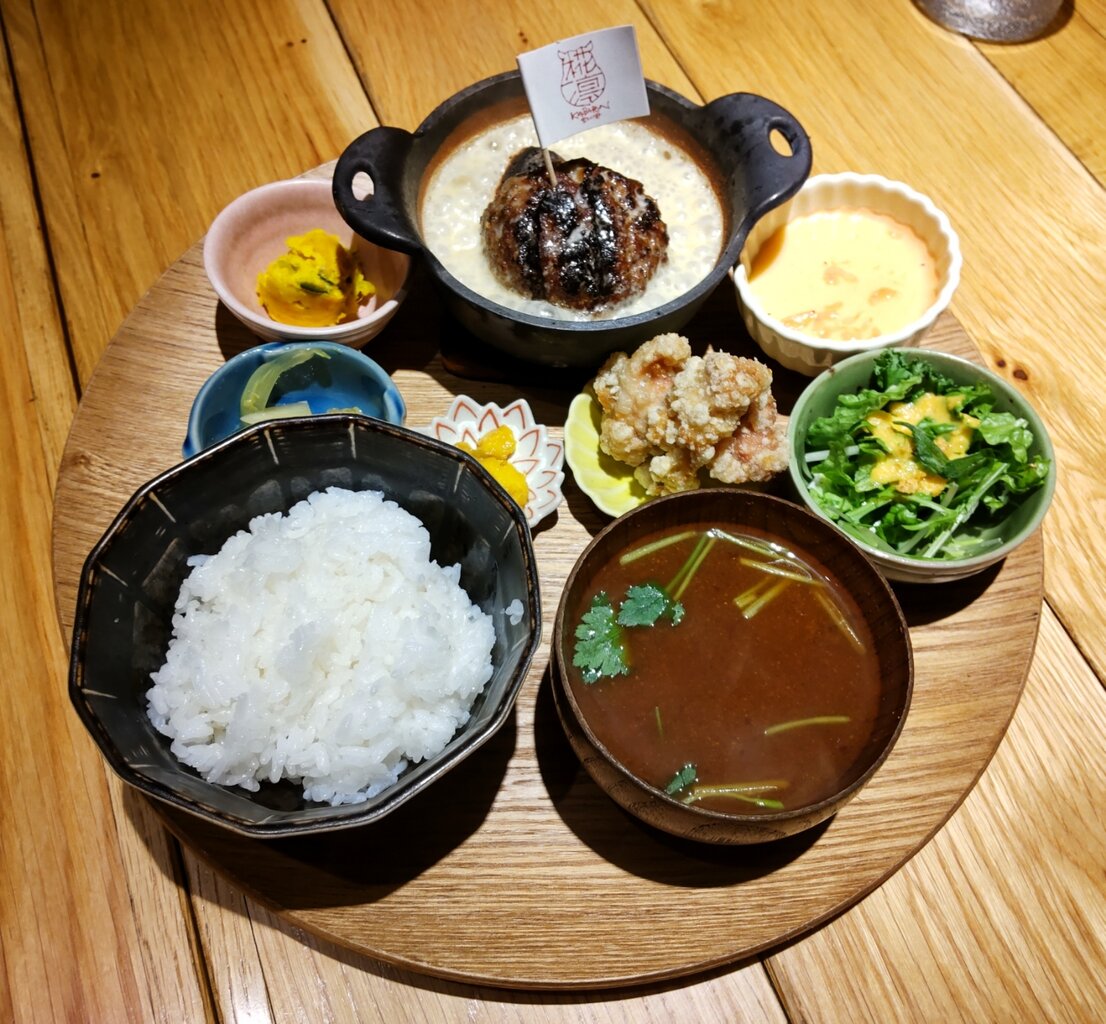 超粗びきのハンバーグと小鉢群のワンプレートで、更にとても美味しすぎる豆乳昆布出汁茶漬けでした✨😋🥩🍚🥢💕
