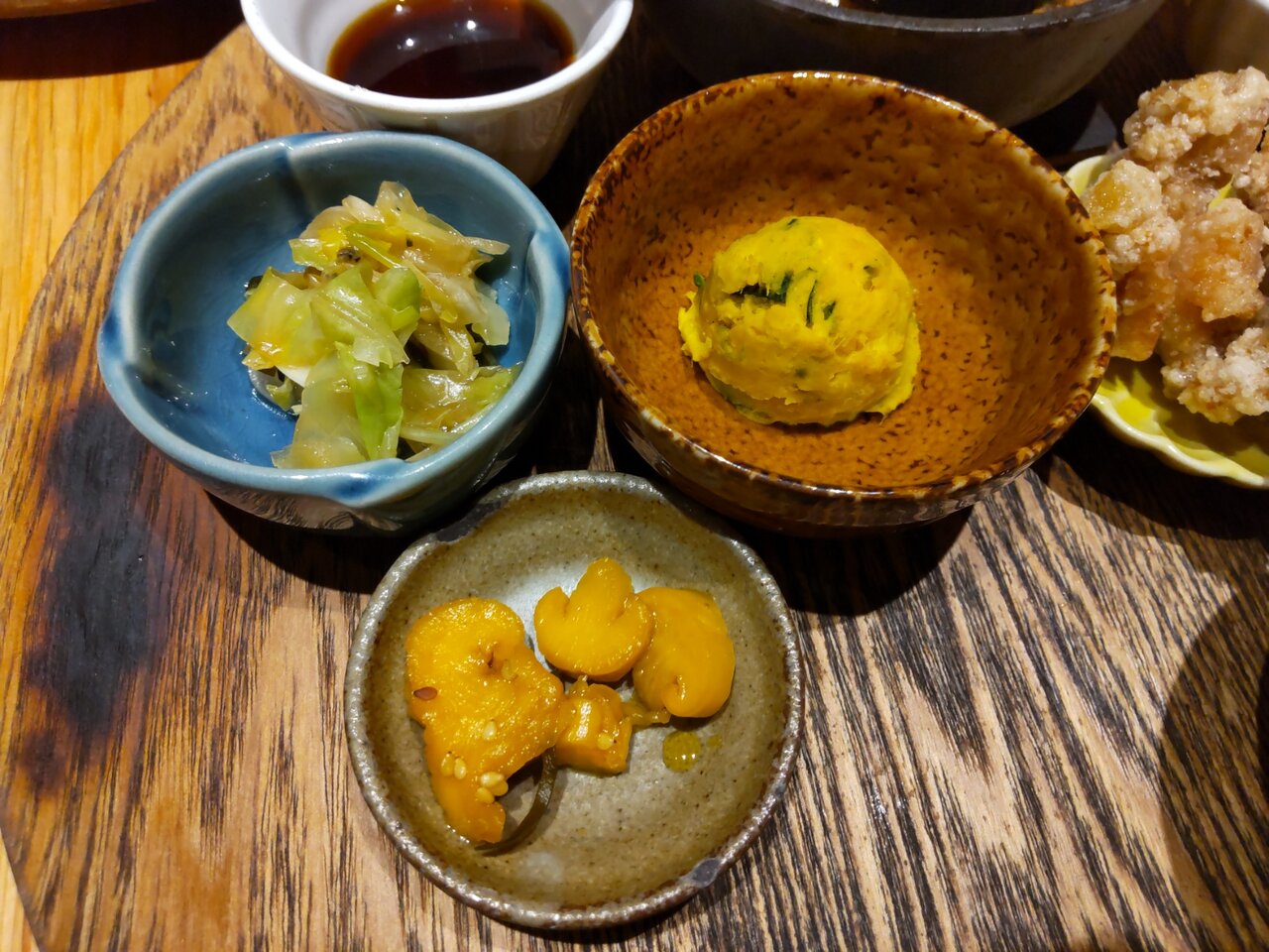 美味しいお新香と、春キャベツと新玉葱の塩昆布和え、カボチャポテトサラダの小鉢さん達🍀