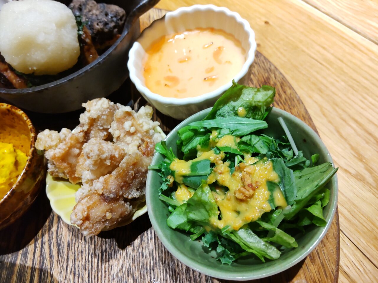 サラダ🥗と、鶏のから揚げと、茶碗蒸しの小鉢さん達🍀